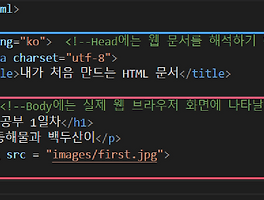 Programming/Html (1) 썸네일형 리스트형 [Html] Html 텍스트 관련 태그 - Day1 Html 공부 1일차 1. 기본태그 - : 문서 유형을 지정하는 태그 - : 웹 문서 시작을 알리는 태그 head태그와 body 태그로 구성 - : 웹 문서를 해석하기 위한 정보를 입력 - : 실제 웹 브라우저 화면에 나타날 내용들을 입력 - : 문자 인코딩 및 문서 키워드, 요약 정보 - : 문서 제목 2. 텍스트 관련 태그 - : 제목 표시, 일반 텍스트보다 진하고 크게 표시 (1이 가장 크고 6이 가장 작다)- : 단락 만들기- : 줄 바꾸기- : 수평줄 넣기- : 인용문 넣기- : 입력하는 그대로 넣기, 예를 들어 공백이 그대로 유지- or : Bold, 진하게- or : Italic, 기울임- : 인용 내용 표시- : 형광펜 표시- : 줄바꿈 없이 영역 묶기, span 태그 하나로는 의미가 없지.. 이전 1 다음